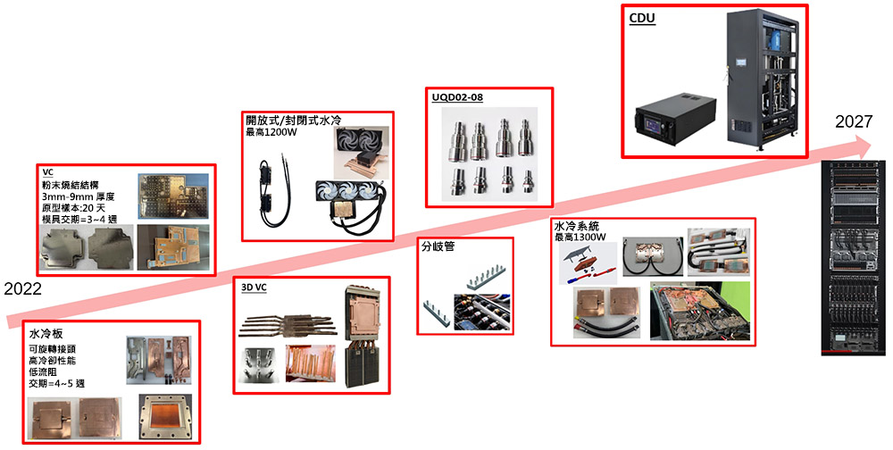 目前本公司已提供完整且多元的散熱解決方案產品組合,涵蓋冷板(Cold Plate)、均熱板(Vapor Chamber)、先進 3D VC、UQD、歧管系統(Manifold),以及開放式與封閉式液冷系統,全面滿足高效能運算與資料中心之應用需求。